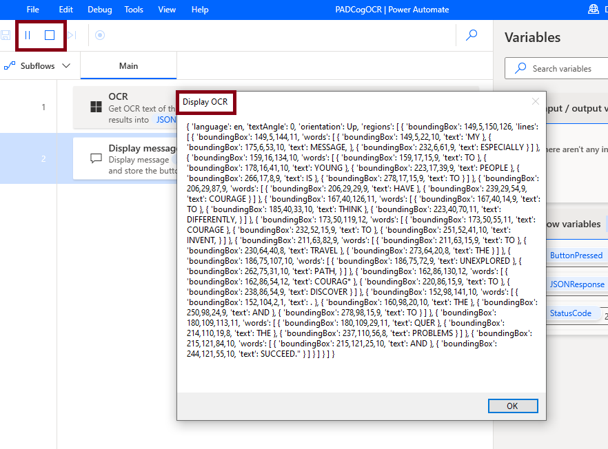 Now you have successfully tested Microsoft cognitive computer vision - OCR action in Desktop flow - PADCogOCR in Microsoft