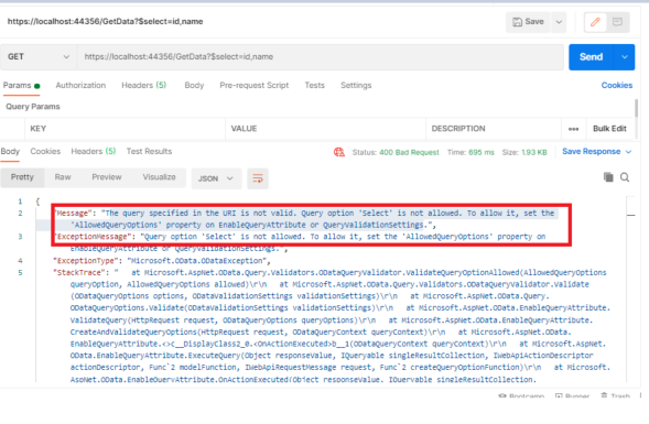 Above example of the query option states that only $filter and $orderby queries are allowed on the API.
