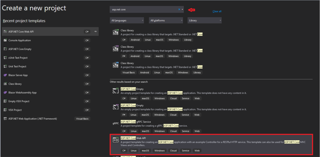 Visual Studio 2019 is necessary to create the ASP.NET Core 5.0 web API or application. So, Let's select the "ASP.NET Core Web API" project template in the following dialog to create the skeleton of the project.