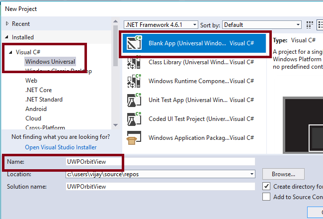 Open Visual Studio 2017. Go to Start -> New Project -> select Windows Universal (under Visual C#) -> Blank App (Universal Windows) -> Give a suitable name for your app (UWPOrbitView) ->OK.