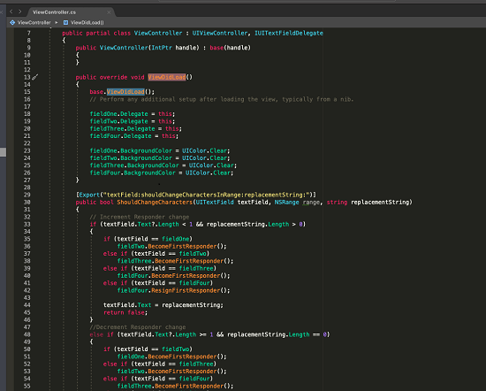 Next, open ViewController.cs file by going >> Solution Explorer >> double click ViewController.cs file. Implement the ViewController class in IUITextFieldDelegate interface and override the ShouldChangeCharacters method. Here, I did simple logic to change the focus of one field to another field. In case you need to validate input in runtime, you can write your validation code before the ResignResponder method.