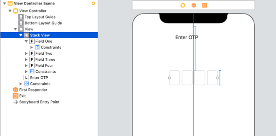Now, open Storyboard in your interface builder by right clicking on Main.Storyboard >> In the context menu select Open with >> followed by XCode Interface Builder (because my favorite designer is XCode). After this, drag Horizontal Stack View from the Toolbox and place the Storyboard as per your requirement and set a perfect constraint to this view. Next, drag TextField from the Toolbox and place it inside the StackView and set the height and width of TextField. Create an outlet for this TextField to access from the code-behind.