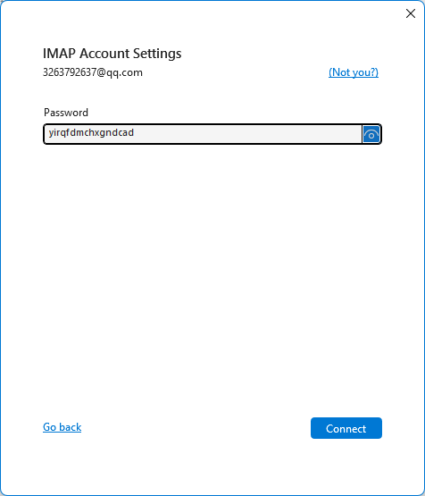 Go back to Outlook, redo the Add an email account to Outlook process, till the IMAP Account Settings, type in the code as Password > Connect