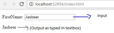 ng-app tells AngularJS that the owner of the Application is <div> tag. The {{ fName }} expression used in the example is the AngularJS data binding expression. It binds AngularJS expressions with AngularJS data. The expression {{ fName }} is connected with ng-model. Whatever n-model will have the value of fName variable, the expression {{ fName }} will get the same. If we run this program, we will get the output given below.