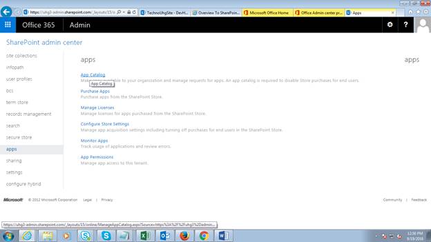 - It will open App Catalog site collection. On the left navigation, open the Apps for Share Point link,