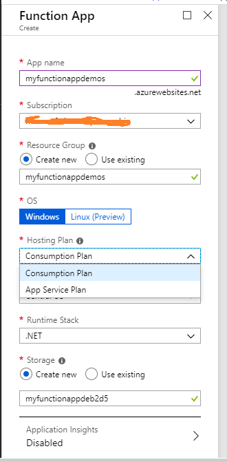 - We have two options for hosting plan - Consumption Plan and App Service Plan; choose the desired one.