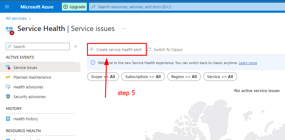 Step 2. After logging in to the Azure portal with your credentials, we need to click on " create a resource", After that, click on the search bar and type Azure service health.
