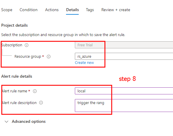Step 7. In this, we need to give the project details like subscription, resource group name, Alert name, and alert description.