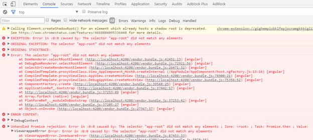 Why am I not getting the desired result? Let’s check it out. Press “F12” and see console section. Here, find an error that “The selector "app-root" did not match any elements”. It means Angular doesn’t find any attribute that can match “app-root”.
