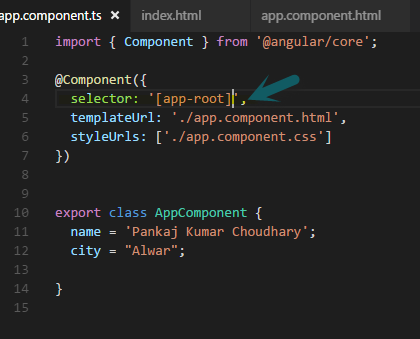 Now, go to your “app.components.ts” file and check the value of “selector” property of the component. Here, the value of the selector property is “app-root” that denotes selector as a “element”. It means, if you want to use the component, then you should define “app-root” as an element.