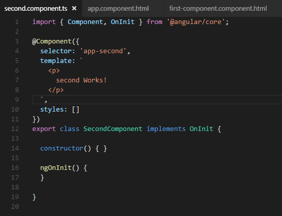 First, open the command prompt Window in your project and move to “first-component” folder and run “ng generate component second --flat -it –is”. In this command “flat” keyword denotes that we don’t want to generate a new folder for this component, create this component in the parent directory and it stands for inline template and inline style.