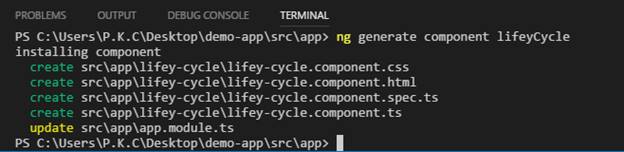 Let’s take an example of the component life cycle. Add a new component named “lifeyCycle”, using “ng generate component lifeyCycle” command.