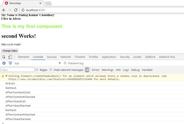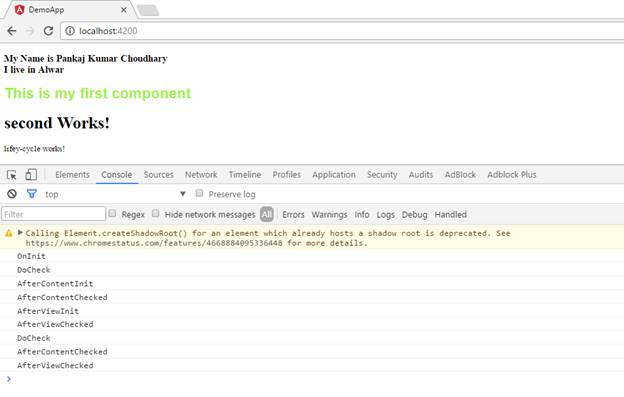 You can see that in first cycle component, it goes through the 6 phases. In this cycle, we don’t get “ngOnChanges” because we don’t bind any values and we also don’t get “ngOnDestroy” phase because till now our component is not destroyed.