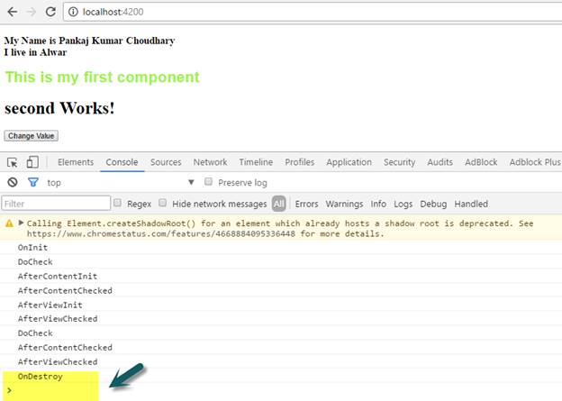 When we click on “Change Value” button ,statement *ngIf="!value", it returns false, so “app-lifey-cycle “ component will be destroyed and now “Ondestory” event will call page.