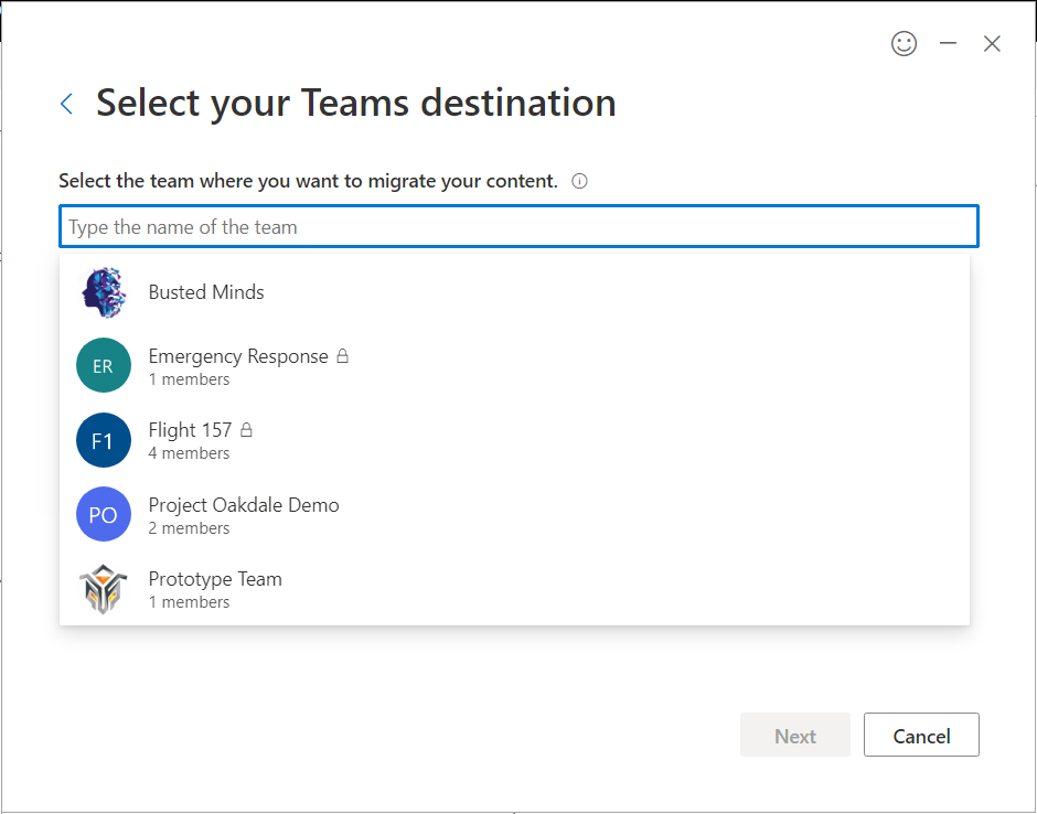 If we select the option as Microsoft Teams, we can choose the Microsoft Teams team to migrate the content to.