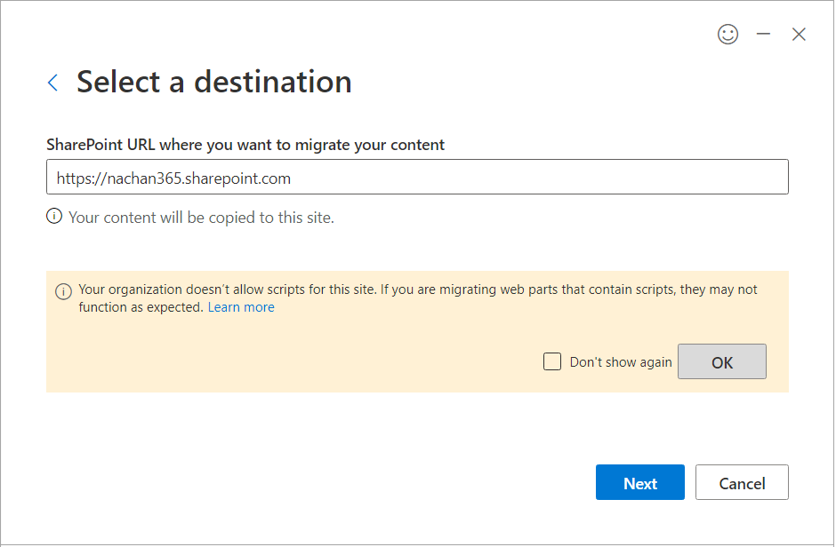 If we select the option as SharePoint, we can mention the SharePoint Online URL to migrate the content to.