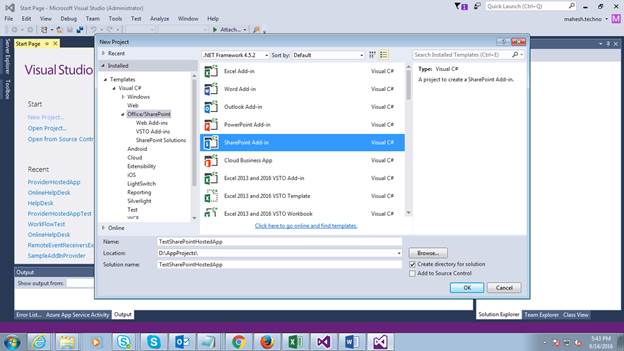 - Create a project name called ‘TestSharePointHostedApp’ by selecting SharePoint Add.
