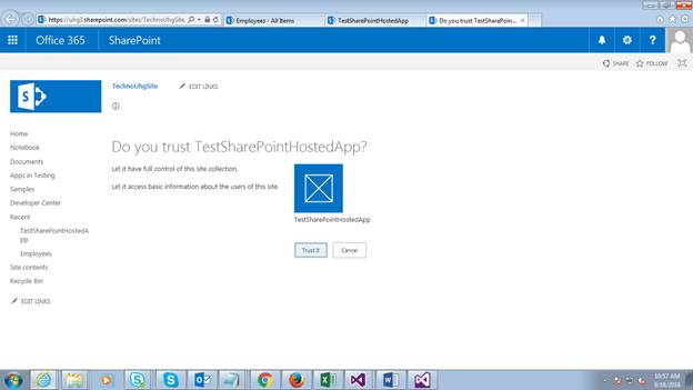 - Provide the office 365 SharePoint Url and select the SharePoint-Hosted App option.