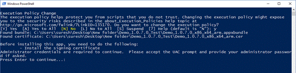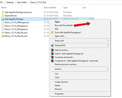 Go to your app package folder and run the “Add-AppDevPackage” file, using power shell, as shown in the following screen.