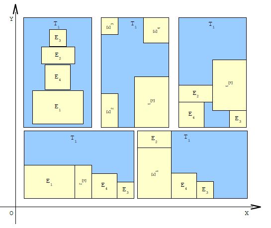 Graphical presentation of five cases of TABLE with packed ELEMENTS inside XY orthogonal coordinate system.