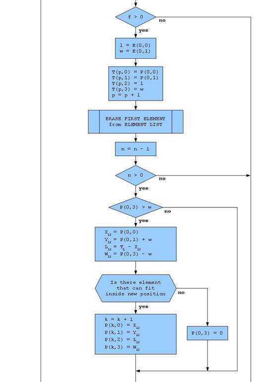 - Before packing process starts, all elements must be horizontally oriented and sorted in descending order by size of it's area then by length then by width.