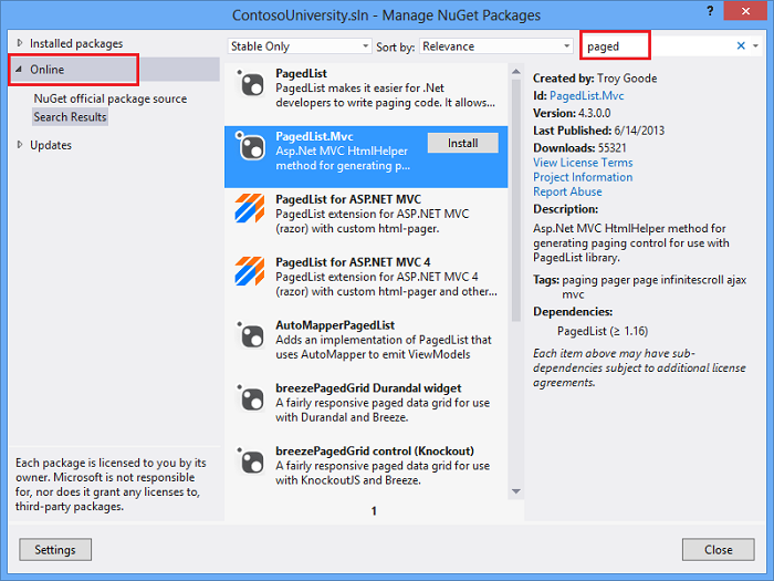 PagedList.MVC from NuGet Package manager, so go to the NuGet Package Manager and then install