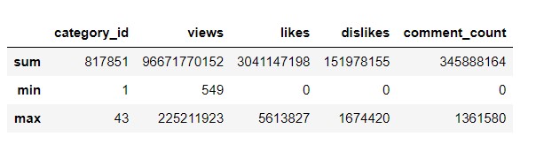 In the ‘likesdf’ DataFrame there are many columns like ‘publish_time’, ‘comments’ etc, let’s fetch all the numeric columns so that easier to apply aggregation functions.