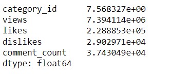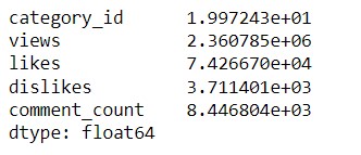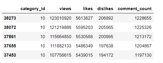 The ‘newlikesdf’ DataFrame now has all the numeric columns like ‘likes’, ‘dislikes’, ‘comment_count’, ‘views’ etc. The 'newlikesdf' DataFrame looks like,