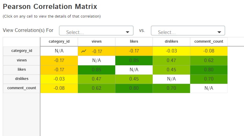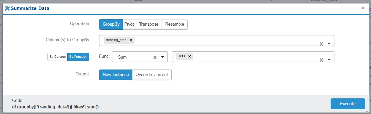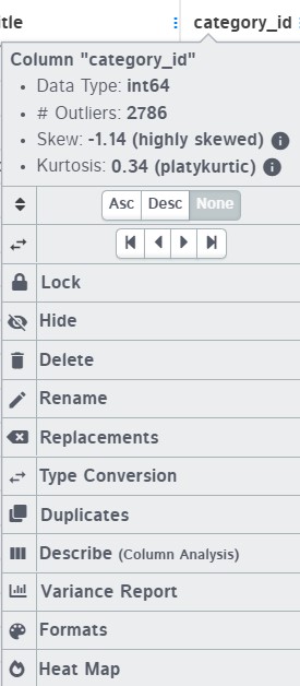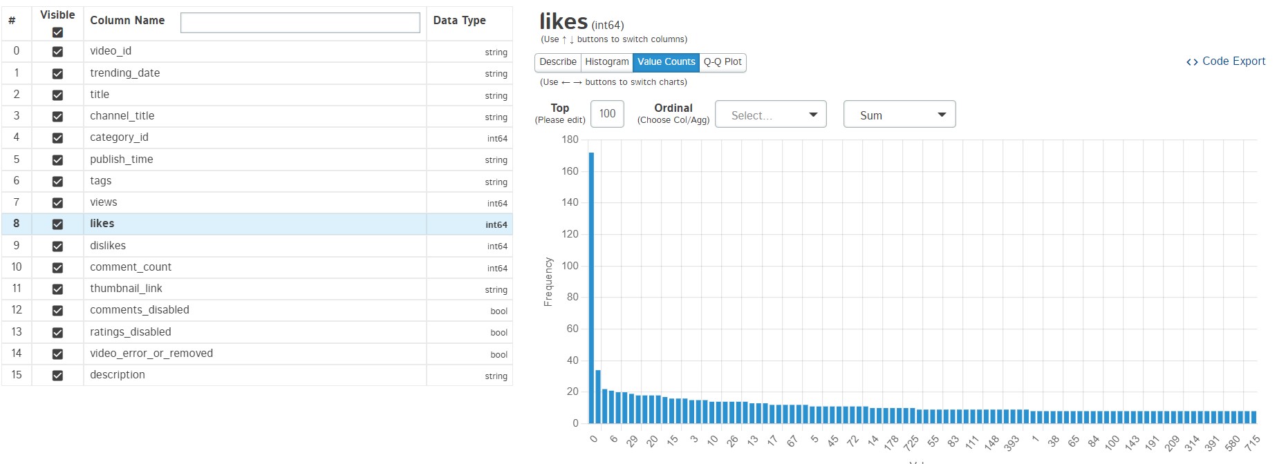 Most interesting option is Describe, the Describe feature provides the statistical analysis of the selected column. Say we want to visualize the ‘likes’ and ‘dislikes’ column, all we need to do is to select the column, and the rest is all done for us.