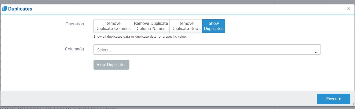Let’s explore some of the options, like Duplicates, Describe, and Heat Map. Duplicates help us in handling duplicate data like removing duplicate columns, showing duplicates, etc by selecting the column on which the operation needs to be performed.