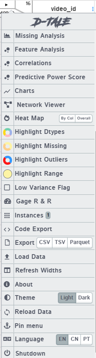 D-Tale shows the data the way pandas do, the magic is in the top left corner of the menu that gives us a variety of options for data exploration, clean-up, and analysis. The below code generate the data in the tabular format on the default browser with the below code