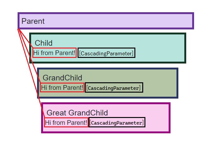 In the following image 2, The Parent can directly communicate with all of its descendants directly just by using CascadingParameter, which means now grandparent can give chocolate directly to their grandchild without their parent eating half of it.