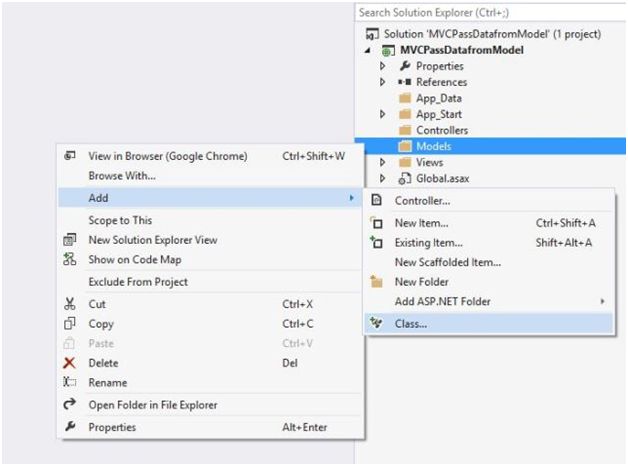 Let us add a class in the Model folder. Right click on Model folder. Go to Add->Class. I have named it Student.cs.