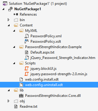 Add two folders into the project, namely content and lib. We can do this by right clicking the project, selecting add and then selecting new folder. I'll add the JavaScript, XML file and sample page into the content folder. The files in the content folder will be added into the target solution during the installation. Now, I want the PasswordStrengthIndicator.Core.dll to be added to the target reference during the installation. In order to do this, I will add the PasswordStrengthIndicator.Core.dll assembly into the lib folder. Next, I'll add web.config.install.xdt and web.config.uninstall.xdt into the Content folder. The purpose of these two files is to add and remove a key into/from the web.config appSettings section during package installation and uninstallation. At this point the solution should look like figure 3.
