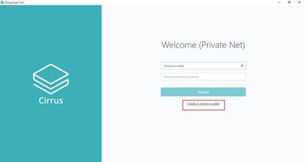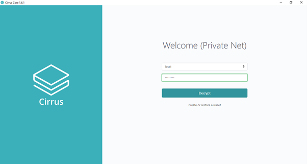 Then, Wallet will ask you for the wallet name and password. Select the wallet name: cirrusdev and provide the password:password and click on Decrypt as illustrated in the picture below.