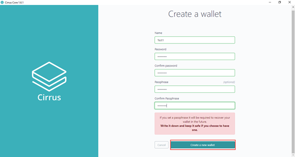 Then provide the Name, Password, and password Phrase and click on Create a new wallet as depicted below.