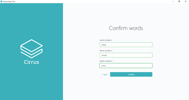 The next step is to confirm that you have kept the mnemonic safely, provide the secret words and click on Confirm.