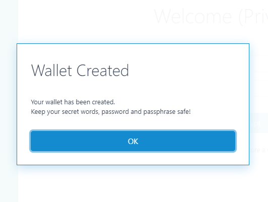 After that, you will get 12 secrete words (mnemonic). Copy these words and keep them in a safe place. Mnemonic is needed in case you need to restore the wallet to another device in the future. As this is in a private network and this wallet is for development and testing purposes, keeping the secret words in a safe place is not much important; however, this is very important when you create a wallet in the main net.