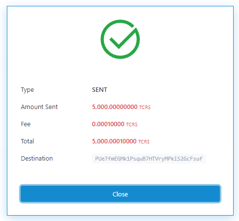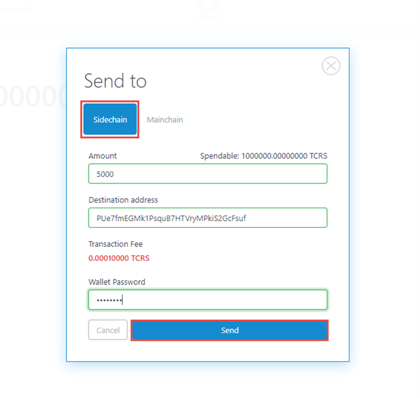 You will then see the below screen where you need to select Sidechain and provide the destination address (the address where you want to send the TCRS), amount, and password of wallet and click Send as illustrated below.