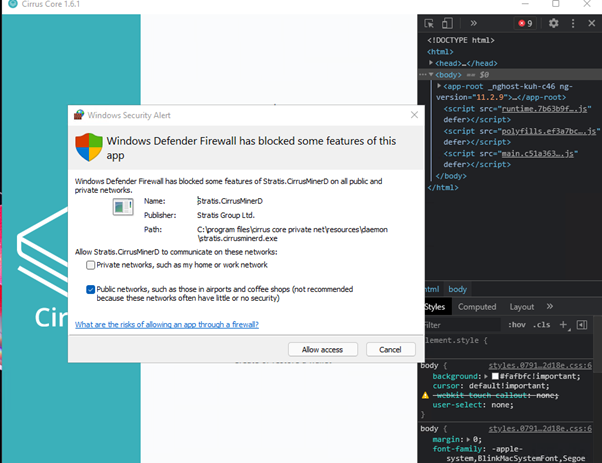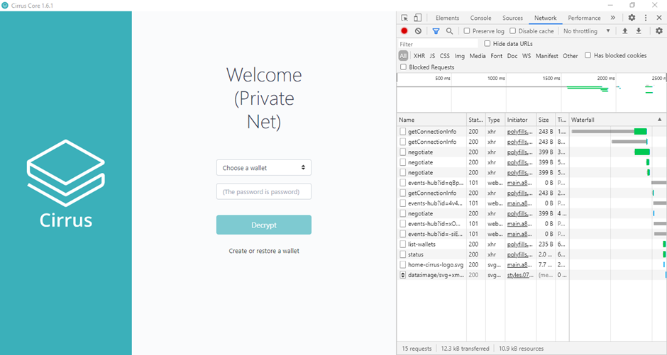 Cirrus Core Private Net wallet runs with an instance of the Stratis Full Node; ‘Stratis.CirrusMinerD’ project in devmode=miner. It provides a graphical user interface for developers to get familiar with cirrus wallet and provides simplicity for development.