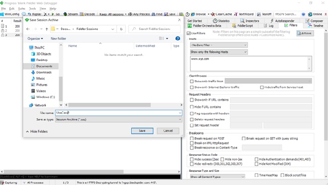 Now once you have the host filter for your application and have cleared all your previously captured sessions, you can start your application, now it will show only outgoing requests from your application. This way fiddler will now show the outgoing traffic only for the use case you are performing in your application. Once you are done with the use case, click on File->Save->All Sessions. This will save all sessions for your use case in .saz file (refer to below screenshot). Make sure before saving the session, it only has requests for your application.