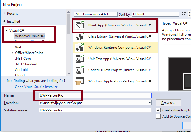 Open Visual studio 2017 -> Start -> New Project-> Select Windows Universal (under Visual C#)-> Blank App(Universal Windows) -> Give the suitable name for your app (UWPPersonPic)->OK.