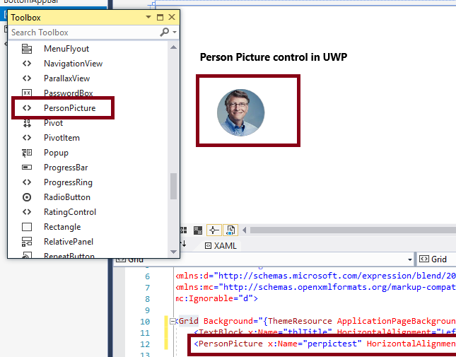 - <PersonPicture x:Name="perpictest" HorizontalAlignment="Left" ProfilePicture="Assets\Bill.jpg" DisplayName="Bill Gates" Margin="131,177,0,0" VerticalAlignment="Top" />