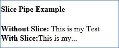 Slice pipe is very similar to “limitto” filter in Angular 1.x but the order of the parameters is reversed. The first parameter of this pipe is start index and the second parameter is limit.