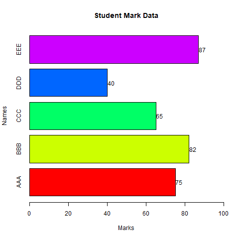 The horiz=TRUE parameter of the barplot() function can be used to plot horizontal bars on a bar plot. The values returned from the barplot() function can be stored in the y vector and the x vector can be created from the values (marks), to be used in the text() function to display the data values.
