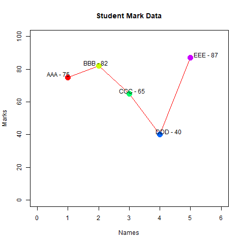 x <- plot(marks,type="o",xlab="Names",ylab="Marks",main="Student Mark Data",