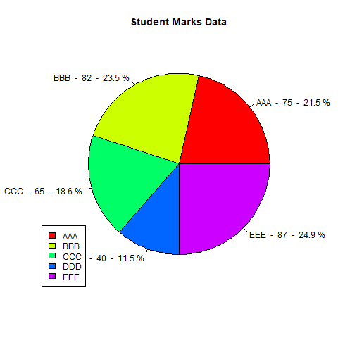 pie(marks,labels=paste(names," - ",marks," - ",percentages,"%"),