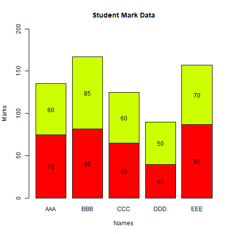 The above code plots names on the X and mark1 and mark2 stacked one above another on the Y-Axis. The text() function has to be used twice to display data values on the bars. The y parameter is divided by 2 to display the data label in the center of the bar vertically. In the second text() function call, the y parameter has to be incremented by the first y value.