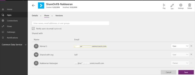 Go back to http://web.powerapps.com and share it with the other users by adding their Names/E-mails.