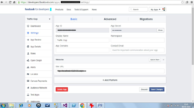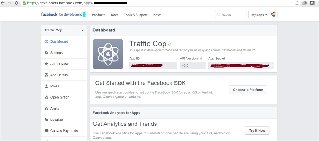 After following above steps, we will be redirected to the following screen. On this screen we can see App Id and App Secret in two fields at the top. App Secret is in password format. Click the “Show” button, this will display App Secret Key.